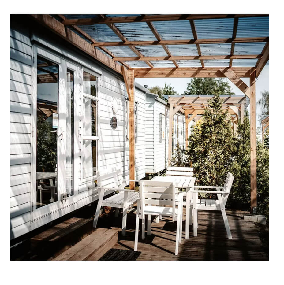Klimatyzowane domki przeznaczone dla 4 osób, zlokalizowane w I linii brzegowej z widokiem na zatokę w cichej części campingu od strony rezerwatu Natura 2000. W domku znajduje się sypialnia z łóżkiem małżeńskim, łazienka z kabiną prysznicową, w pełni wyposażony aneks kuchenny z płytą indukcyjną i dużą lodówką oraz salon pełniący również funkcję sypialnianą. Do domku przynależy duży zadaszony, umeblowany taras z widokiem na Zatokę Pucką oraz jedno miejsce parkingowe.